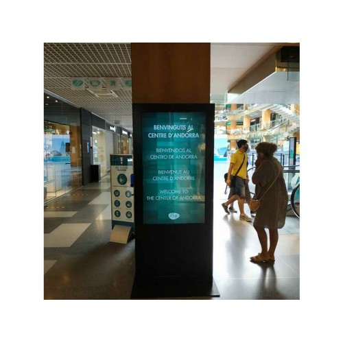 Estructura a suelo para monitor 49” con área visible abierta para el touch, vesa máx 600x400 y peso max soportado 85kg.